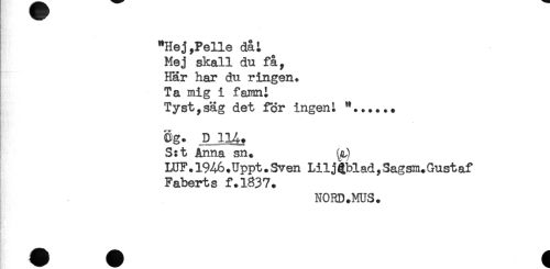 //// R* //// "Hej,Pelle dåi //// Mej skall du få, //// Här har du ringen. //// Ta mig i famni //// Tyst,säg det för ingenL "...... //// Cg- _D 114, //// S:t Anna sn. //// LUF.19A6.Uppt.Sven Liljgblad,Sagsm.Gustaf //// Faberts f.1837. //// NORD.MUS. ////