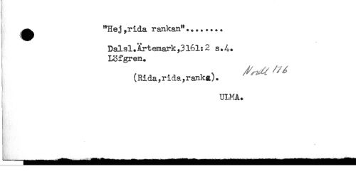 //// } //// ) //// ^ "Hej,rida rankan"........ //// Dalsl.Ärtemark,3161:2 s.4. //// Löfgren. //// (Rida,rida,ranka). //// i //// ULMA. //// ! //// * ////