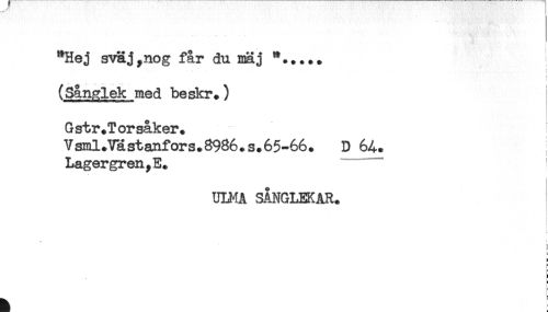 //// Vi:. //// "Hej sva j,nog får du maj *..... //// ! //// (Sånglek med be skr.) //// Gstr.Torsåker. //// Vsml.Vastanfors.8986.s.65-66. D 64. //// Lagergren,E. ! //// ULMA SÅNGLEKAR. //// ! //// . < //// B //// : ////