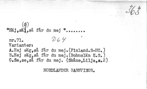 //// jysäj,så får du mej ....... //// nr. 71. / //// Varianter: //// A.Hej sägyså får du mej. (Finland.S-HC.) //// B.Hej säg^så^får du mej.(Bohuslän E.S.) //// C+Seyseysa får du mej. (SkåneyLiljayS.2) //// NORDLA^mER BARMVISOR. //// ! //// i ////