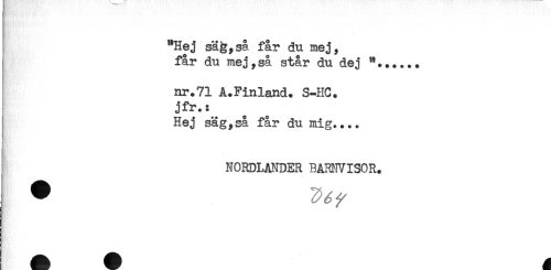 //// "Hej sä^ysa får du mej, //// j får du mej,så står du dej **..... //// nr.71 A.Finland. S-HC. //// jfr.: //// Hej sägyså får du mig.... //// NORDLANDER BARNVISOR. ////