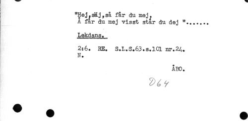 //// "Hej^säj,så får du mej. //// A far du mej visst star du dej //// Lekdans. //// 2:6. RE. S.L.S.63.s.ld nr.24. //// N. //// ABO. ////