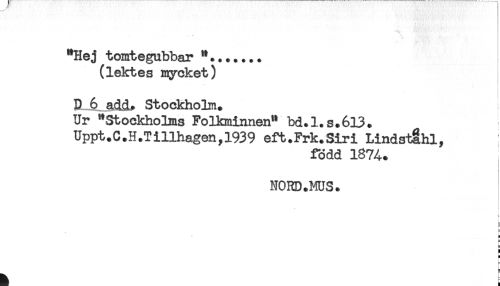 //// "Hej tomtegubbar //// (lektes mycket) //// D 6 add# Stockholm. //// Ur "Stockholms Folkminnen" bd.l.s.613. //// Uppt.C.H.T illhagen,1939 eft.Frk.Siri Lindstahl, //// född 1874. //// NORD.MUS. //// t //// = //// g //// a //// H ////