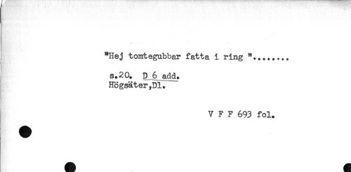 //// "Hej tonrtegnbbar fatta i ring //// i //// K; //// s.20. D 6 add. //// } Högsäter,Dl. //// V F F 693 fol. ////
