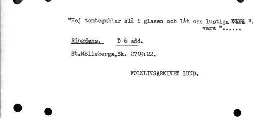 //// "Hej tomtegubbar slå i glasen och låt oss lustiga XB6X //// vara **...... //// Ringdans. D 6 add. //// St.M811eberga,Sk. 270?: 22. //// FOLKUVSARKIVET LUND. ////