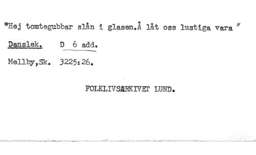 //// "Hej tomtegubbar slån i glasen.Å låt oss lustiga vara * //// Danslek. D 6 add. //// Mellby,Sk. 3225:26. //// FOIZUVSARKIVET LUND. ////