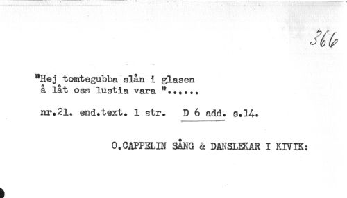 //// "Hej tomtegubba slån i glasen //// å låt oss lustia vara *...... //// nr.2l. end.text. 1 str. D 6 add. s.14. //// 0.CAPPELIN SANG & DMSLEKAR I KIVIK: ////
