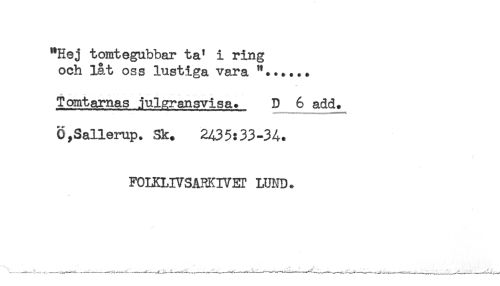 //// "Hej tomtegubbar ta' i ring //// och låt oss lustiga vara ".**..* //// Tomtarnas julgransvisa. D 6 add. //// Ö,Sallerup. Sk. 2435:33-34. //// FOLKLIVSARKIVET LUND. ////