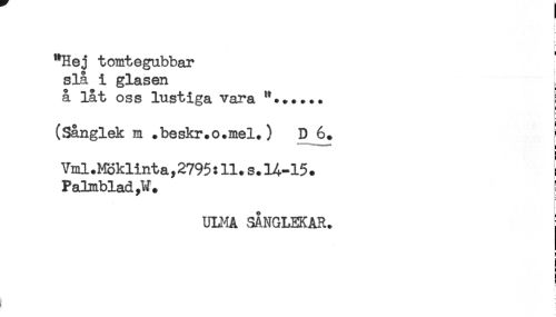 //// "Hej tomtegubbar //// slå i glasen . //// å låt oss lustiga vara { //// (Sånglek m .beskr.o.mel.) D 6. I //// Vml.Moklinta, 2795:11.s. H-15 . ! //// Palmblad //// UU^IA SANGLEKAR. //// i //// i //// : ////