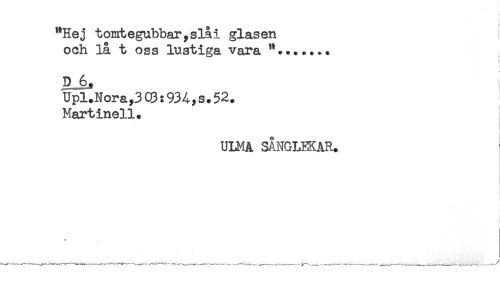 //// < //// "Hej tomtegubbar,slåi glasen //// och lå t oss lustiga vara ".....*. //// D 6. //// Upl.Nora,3C9:934,s.52. //// Martinell. //// ! //// ULMA SÅNGLEKAR. //// ! //// - //// . //// ' //// ] //// ! ////