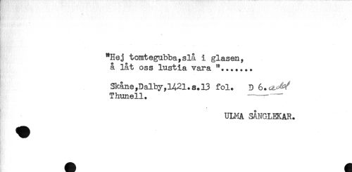 //// ' ' ' . - . ' . - //// t //// - //// "Hej tomtegubba.slå i glasen, //// a lat oss Instia vara //// Skåne,Dalby-,14.2l.s.l3 fol. D //// Thunell. --— //// ULMA SÅNGLEKAR. ////