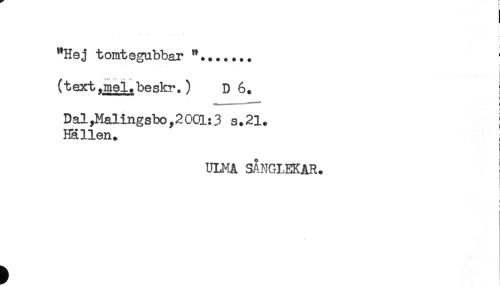 //// ! //// ^ -r.-h -=-:. r. - //// (text.mel.beskr.) D6. //// - //// Dal,Malingsbo,2001:3 s.2l. ; //// Hällen. //// ULMA SÅ.NCLEKAR. //// i //// - //// i //// i ////