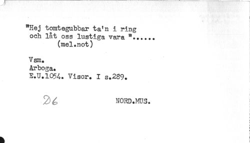 //// - //// "Hej tomtegubbar ta'n i ring //// och låt oss lustiga vara //// (mel.not) ; //// V sm. //// Arboga. //// E.U.10%* Visor. I s.2S9. //// t //// f //// : //// 2)^. NORD.MUS. //// t //// ^ //// ! //// : //// * ////