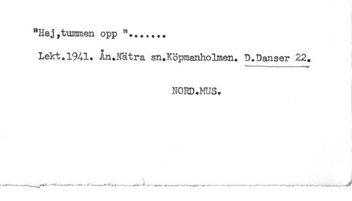 //// [ //// "Hej,tummen opp //// * * //// o //// Lekt. 1941. An.Nätra sn.Köpmanholmen. D.Danser 22. //// i //// NORD.MUS. //// . ////
