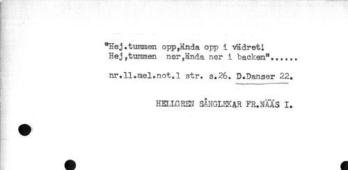 //// "Hej.tummen opp,ända opp i vädret //// Hej,tummen ner,ända ner i backen"...... //// . //// t //// nr.ll.mel.not.l str. s.26. D.Danser 22. //// 8 //// t //// HEI,LGRH'J SÅNGLEKAR FR.NAÄS 1. ////