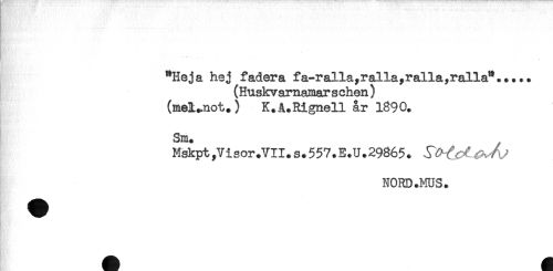 //// * //// "Heja hej fadera fa-ralla,ralla,ralla,ralla*..... //// (Huskvarnamarschen) //// (mel^not.) K.A.Rignell år 1890. //// Sm. //// Mskpt,Visor.VII.s.557.E.U.29865. //// NORD.MUS. ////