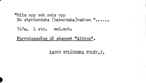 //// "Hiis opp och reis opp i //// Du styrbordska (babordska)vakten "...... //// 747a. 1 str. mel.not. //// Furrningssång på skeppet "Albion". //// LAGU3 NYLÄNDSKA F0LKV.3. ////