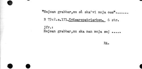 //// "Hejsan grabbar,nu så ska'vi moja oss"....... //// B 73:2.s.l71+Kväsarepatriarken. 6 str. //// - //// jfr.: //// Hejsan grabbar,nu ska man moja sej ..... //// RA. ////
