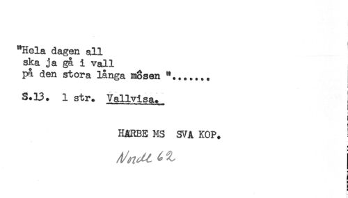 //// "Hela dagen all //// ska ja gå i vall //// på den stora långa mosen *....... //// i //// i //// S.33. 1 str. Vallvisa. //// ! //// i //// HARBE MS SVA KOP. //// g //// j //// s //// e ////