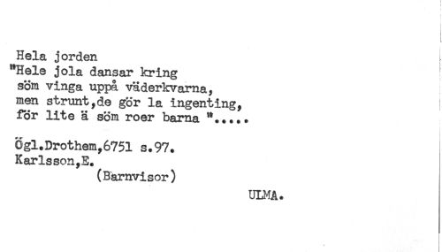 //// i //// ^ //// - //// Hela j orden ^ //// "Hele jola dansar kring //// söm vinga uppa väderkvarna, //// men strunt,de gör la ingenting, ) //// för lite ä söm roer bama //// ...... i //// Ogl.Drothem,6751 s.97. //// Karlsson,E. //// (Barnvisor) //// ULMA. ////
