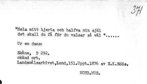 //// "Hela mitt hjerta och halfva min själ //// det skall du få för du valsar så väl "...... //// Ur en dans: //// Skåne, D 292. //// okänd ort. //// Landsimlsarkivet,Lund,151^Uppt.l876 av E.K.BSös^ ////