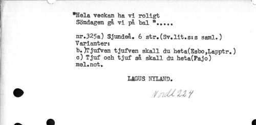 //// "Hela veckan ha vi roligt //// Söndagen gå vi på bal **..... //// nr.325a) Sjundeå. 6 str.(Sv.lit.s:s saial.) //// Varianter: //// b^ )T jufven t jufven skall du heta(Esbo,Lapptr.) //// c) Tjuf och tjuf så skall du heta(Pajo) //// mel.not. //// LAGUS NYLAND. ////