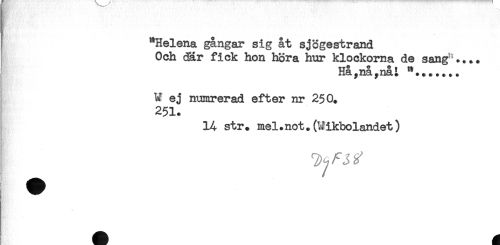 //// "Helena gångar sig åt sjögestrand //// Och dar fick hon hora hur klockorna de sang'.... //// W ej numrerad efter nr 250. //// 251. //// 14 str. mel.not.(Wikbolandet) //// A ^ ////