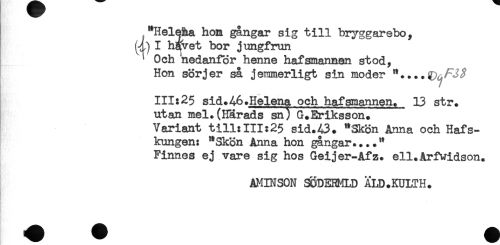 //// "Heleha horn gångar sig till bryggarebo, //// (-i) I h^vet bor jungfrun //// t Och nedanför henne hafsmannen stod^ //// Hon sörjer så jemmerligt sin moder //// 111:25 sid.46.Helena och hafsmannen. 13 str. //// utan mel.(Härads sn) G.Eriksson. //// Variant till:111:25 sid.43. "Skön Anna och Hafs- //// kungen: "Skön Anna hon gångar...." //// Finnes ej vare sig hos Geijer-Afz. ell.Arfwidson. //// AMINSON SÖDEHMLD ALD.KULTH. ////