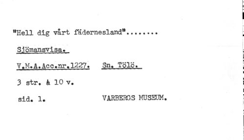 //// "Hell dig vårt fädernesland"........ //// Sjomansvisa. //// — //// r //// V.M.A.Acc.nr.1227. Sn. Tölö. [ //// 3 str. å 10 v. s //// sid. 1. VARBE3GS MUSEUM. [ //// ! //// i ////