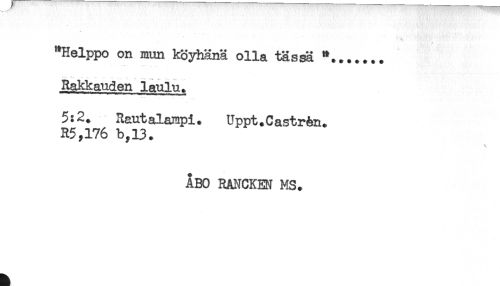 //// "Helppo on mun köyhänä olla tassa **....... //// Rakkauden laulu. //// 5:2. Rautalampi. Uppt.Castrén. //// R5,176 b,13. //// \ //// ÅBO RANCKEN MS. ////