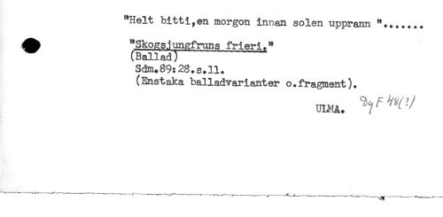 //// "Helt bitti,en morgon innan solen upprann *....... //// "Skoasjungfruns frieri." //// (Ballad) //// Sdm.89:28.s.ll. //// (Enstaka balladvarianter o.fragment). ////
