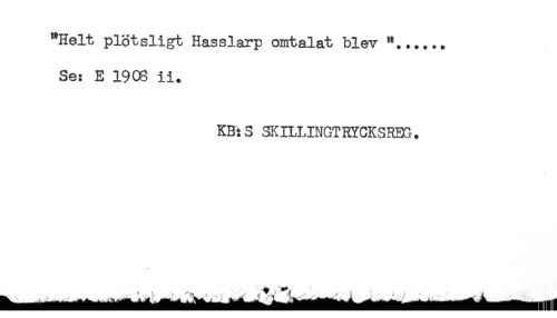 //// "Helt plötsligt Hasslarp omtalat blev *...... //// Se: E 1908 ii. //// KBiS SKILLINCTRYCKSRBG. ////