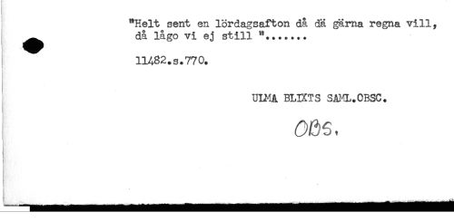 //// t //// "Helt sent en lördagsafton då dä gärna regna vill, //// ^^ då lågo vi ej still //// ! 11432.S.770. //// UU-1A BLIXTS SAKL.OBSC. //// OÖ5. //// i //// < ////