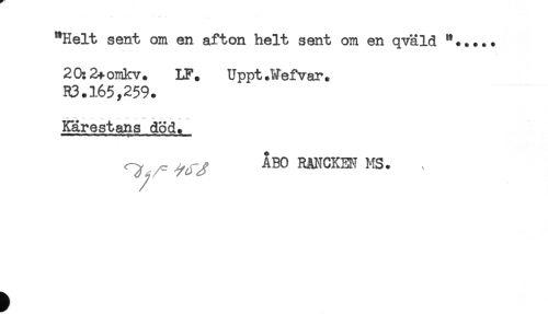 //// "Helt sent om en afton helt sent om en qväld "..... //// 20:2+omkv. LF. Uppt.Wefvar. //// R3.165,259. //// Kärestans död. //// I < .„ . ........... //// ^ ^ ^BO RANCKEM MS. ////