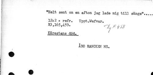 //// "Helt sent om en afton j ag lade mig til], sängs" *.... //// 12:2 4 refr. Upnt.Wefvar. //// R3,165,459. * ^ //// Kärestans död. //// j ÅBO RANGKEN MS. //// i ( ////