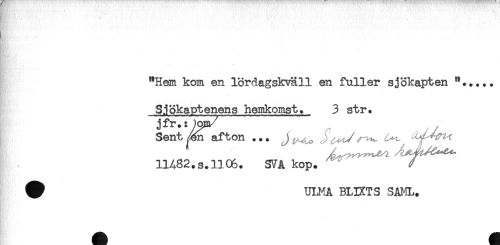 //// M ' //// ) //// - //// "Hem kom en lördagskväll en fuller sjökapten "..... //// Sjökaptenens hemkomst. 3 str. //// Sent Åfafton ... J^, , ^ //// 11A82.S.1106. SVA kop. / //// ^ ULMA BLIXTS SAML. ////