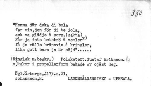 //// ! //// i //// * //// < //// i //// "Hemma där duka di bola //// far min,den för di te jola, //// ack va glädje å sorg.(sakta) ^ //// Får ja inte betebrö å vemler^^ //// få ja välle brännvin å kringler, //// lika gott bara ja är nöjd"...... //// (Ringlek m.beskr.) Polsketext.Gustaf Eriksson.!/ //// x)kakor i propellerform bakade av ojäst deg. //// egl.Srberga,4173.s.21. //// Johansson,H. LANDSMALSARKIVET UPPSALA. ////