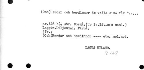 //// (Och)Herdar och herdinnor de valla sina får "..... //// nr.326 b)4 str. Borgå.(Ur Sv.lit.s:s saml.) //// Lapptr.Liljendal. Pärnå. //// jfr.: //// (Och)Herdar och herdinnor —— etc. mel.not. //// LAGUS NYLAND. ////