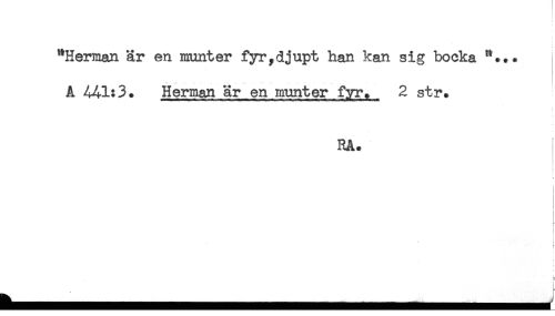 //// "Herman är en munter fyr,djupt han kan sig bocka "... //// A 441:3. Herman är en munter fyr. 2 str. //// RA. //// ! //// i //// < ! //// < ////