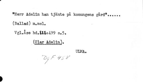 //// "Herr Ådelin han tjänte på konungens gård"...... //// (Ballad) m.mel. //// Vgl.Ase hd.lAt:A99 s.5. //// (Olar Adelin). //// ULMA. ////