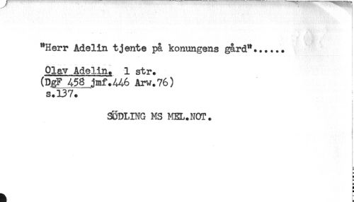 //// "Herr Adelin tjente på konungens gård"...... //// Olav Adelin. 1 str. //// (DgF 458jmf.AA6 Arw. 76) //// s.137. //// i //// i //// SÖDLING MS MEL.NOT. //// . //// 5 //// i ////