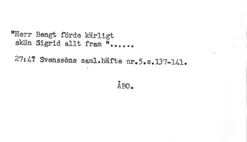 //// "Herr Bengt förde kärligt //// skön Sigrid allt fram "...... //// * //// 27:4? Svenssans saml.häfte nr.5.s. 137-141. //// < //// j //// ÅBO. //// i //// ^ //// i //// i ////