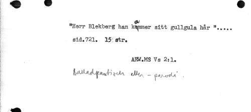 //// Bt - //// "Herr Blekberg han k^amer sitt gullgula hår *.+... //// K'" //// sid. 721. 15 3tr. //// ABK.MS Vs 2:1. ////