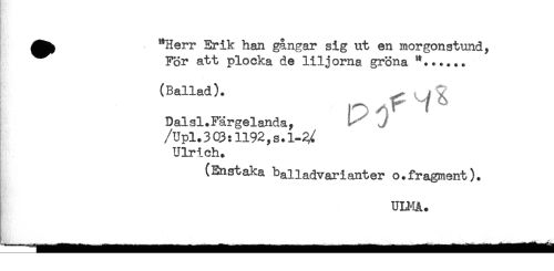 //// K //// ^^ "Herr Erik han gångar sig ut en morgonstund, //// ^^ For att plocka de liljorna gröna //// Dalsl.Färgelanda, //// /Upl.3Q3:1192,s.l-^ //// Ulrich. //// (Enstaka balladvarianter o.fragment). //// ULMA. ////