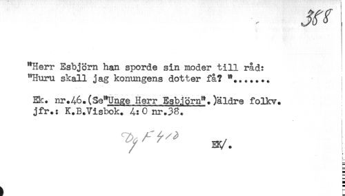 //// "Herr Esbjörn han sporde sin moder till råd: //// "Huru skall jag konungens dotter få? "....... //// Ek. nr.46.(Se"Unge Herr Esbjörn". )äldre folkv. //// jfr.: K.B.Visbok. 4:0 nr.38. //// c //// a ////