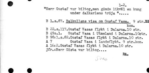 //// V 1-2. //// "Herr Gustaf var biltog,men gömde likväl en kung //// under dalkarlens tröja "..... //// B l.s.87. Dalkullans visa om Gustaf Vasa. 9 str .XX //// kom. //// B 22.s.ll7.Gustaf Vasas flykt i Dalarna. 10 str. //// B 49s.l. Gustaf Vasa i Utmeland i Dalarna. lOstr. //// B 98:l.s.82.Gustaf Vasas flykt i Dalarna.lO str. //// A 7 Gustaf Vasa i landsflykt. 9 str.kom. //// A l6:2.Gustaf Vasas flykt i Dalarna.lO str. //// jfr.:Herr Gösta var biltog.... //// RA. //// * * # ////