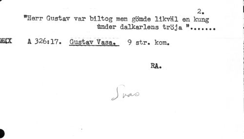 //// 2. ' //// "Herr Gustav var biltog men gömde likväl en kung //// tmder dalkarlens tröja "....... //// SXX & 326:17. Gustav Vasa. 9 str. kom. ; //// * * [ //// ! //// RA. I //// ' //// J ^^ //// l ////