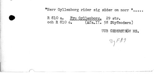 //// "Herr Gyllenborg rider sig söder om norr "..... //// ^ R 810 a. Fru Gyllenborg. 29 str. //// och R 810 c. (Afz.II. 58 Styfmodern) //// UUB CEDERSTROM MS. //// [____^............. r ^______ _____,.............——..... ////