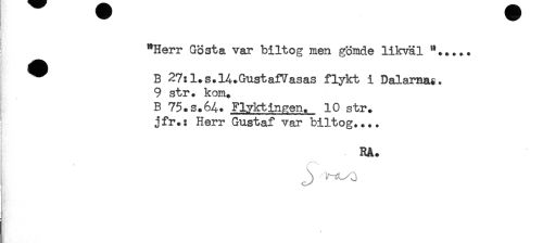 //// f //// i //// ) //// "Herr Gösta var biltog men gömde likväl "*.... //// ^ B 27:l.s.lA.GustafTasas flykt i Dalarnas. //// 9 str. kom. //// B 75.S.64. Flyktingen. 10 str. //// jfr.: Herr Gustaf var biltog.... //// RA. ////