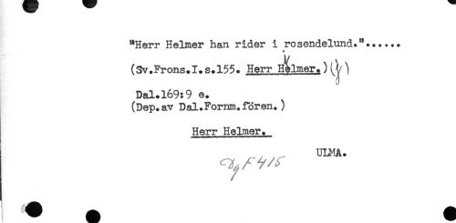 //// "Herr Helmer han rider i rosendelund."...... //// (Sv.Frons+I.s.155. Herr H^Lner.) //// Dal.l69:9 e. //// (Dep.av Dal.Fornm.fören.) //// Herr Helmer. //// ULMA. ////